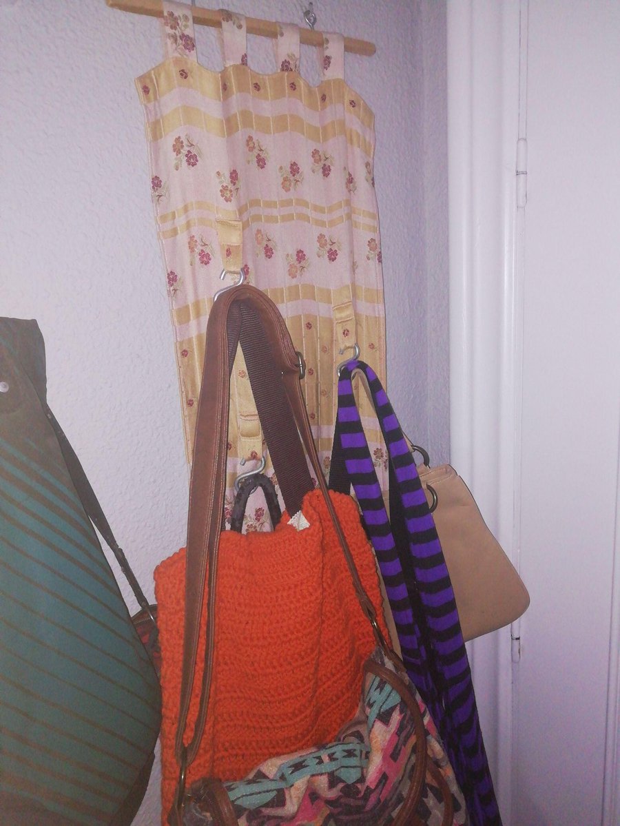 4. Para sujetar los bolsos, se utilizan enganches metálicos quedando sujetos por tiras (restos de la misma tela 12cm de largo x 3cm ancho) estas tiras están cosidas a lo largo de la tela de cortina.