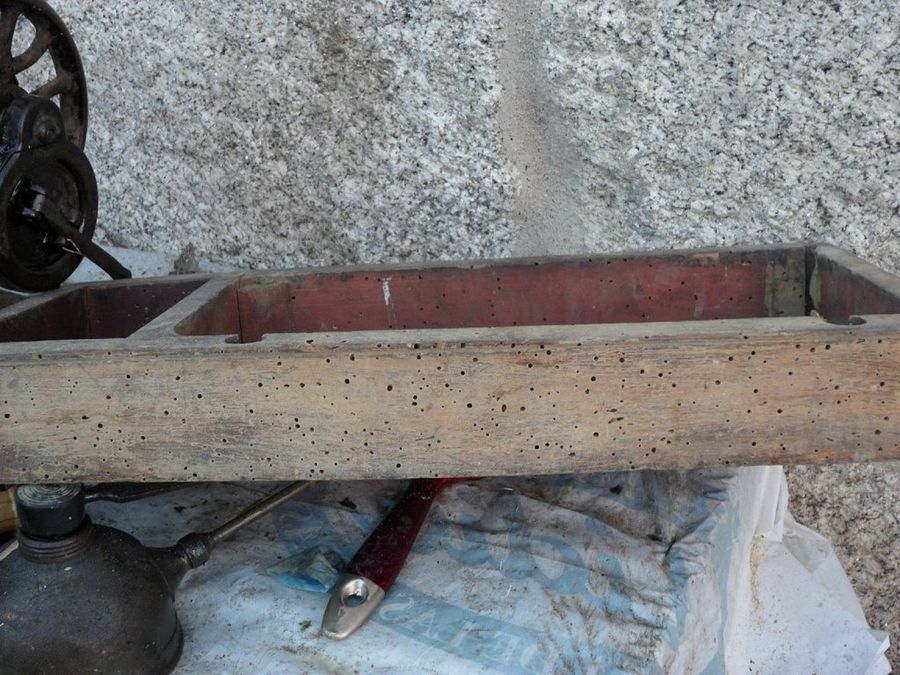 "La cajita donde va asentada otro tanto de lo mismo, cuando quise pasarle un cepillo se me deshizo toda, tiene demasiados bichitos y es imposible restaurarla". Como vemos, la madera ha sido acribillada por la carcoma.