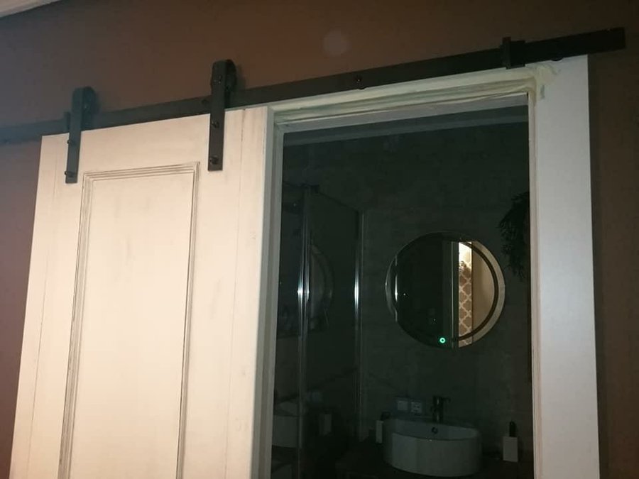 Después de muchos problemas, he tuneado también la puerta. El reto era adaptar la puerta que tenía y convertirla en corredera. Lo más fácil, comprar el herraje, los problemas llegaron después. Primero, la puerta es estrecha, por lo que añado listones a los lados....Es corta, me toca poner en herraje en la jamba de arriba.(agujereé un cable con el taladro, menuda odises solucionarlo)...y tercero para que quede bien pegada tengo que cambiar jambas y quitar todos los junquillos que sobresalgan, en finnnn....modificación completa. Tapar el marco y puerta, todos los agujeros de bisagras, manillas y escalones para el cierre de la puerta. Después poner cierre nuevo, manillas empotradas....asas... Pintarla para disimular todo lo el estropicio.anterior....en fin, muy laborioso todo pero contenta con el resultado.