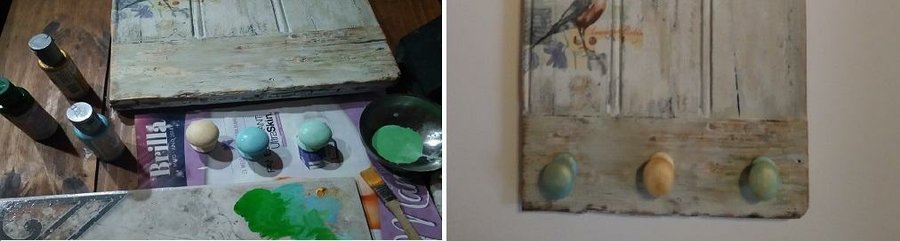 Paso 6 - Encontré tiradores de madera para usarlos como perchas en la parte inferior. Para ello los pinté con colores pastel, mezclando y probando.