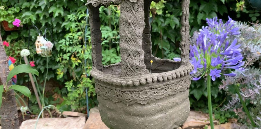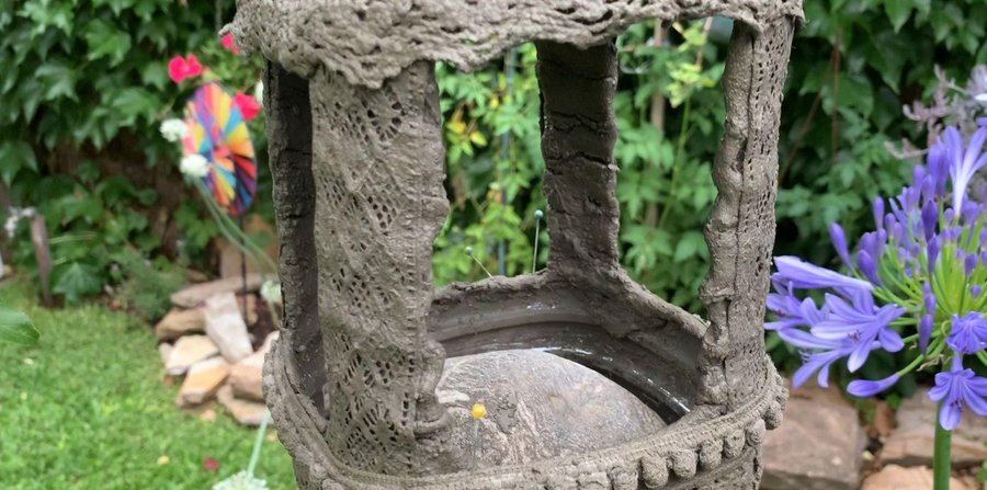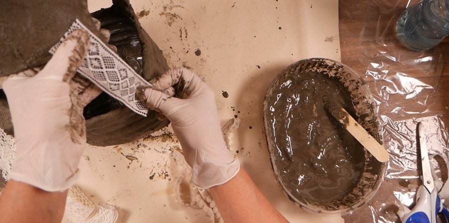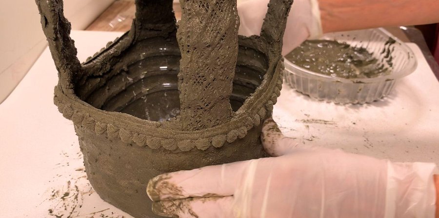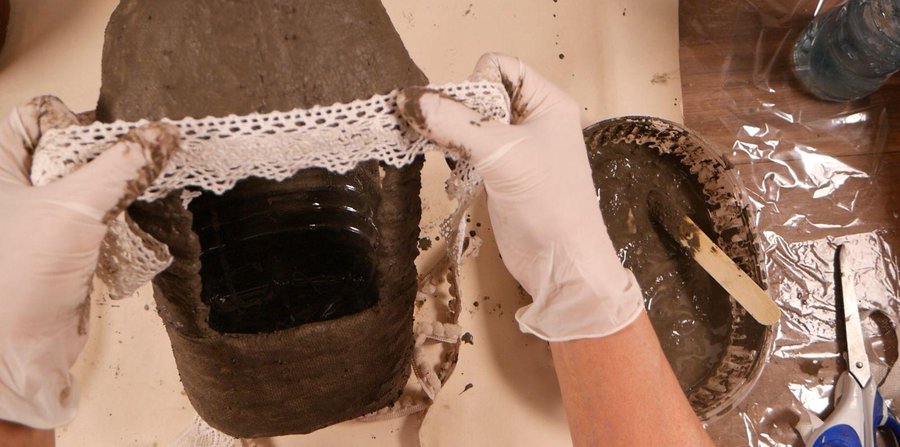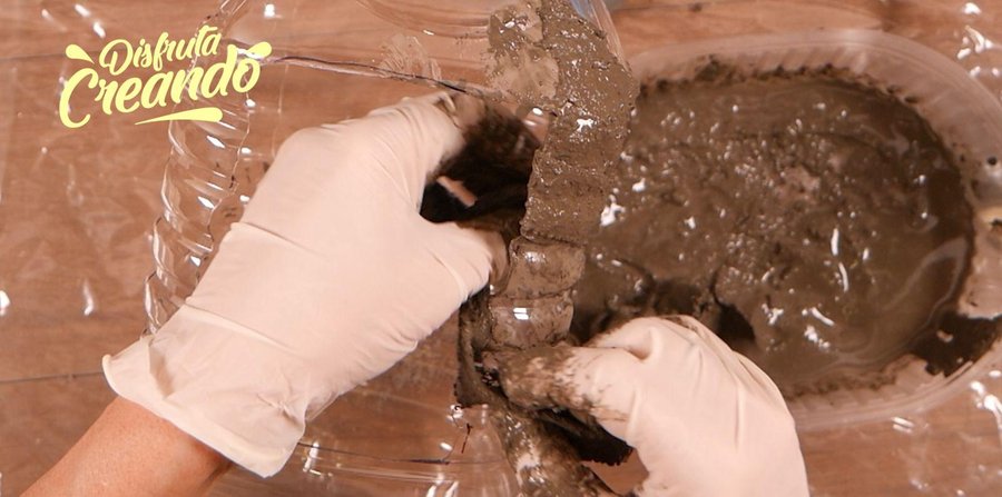 Han podido observar que la tela con el cemento se pega muy bien al plástico y puedo ir agregándole piezas una sobre otras sin problema.
