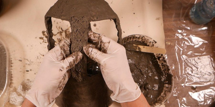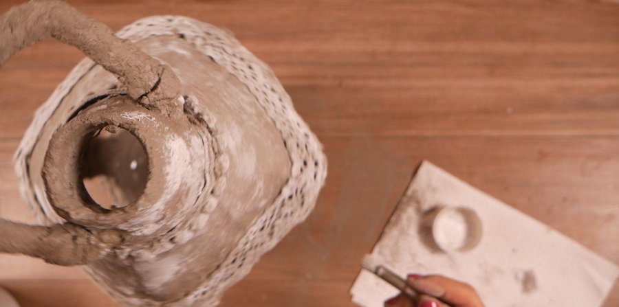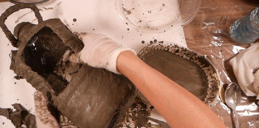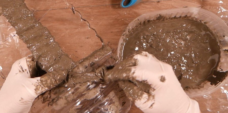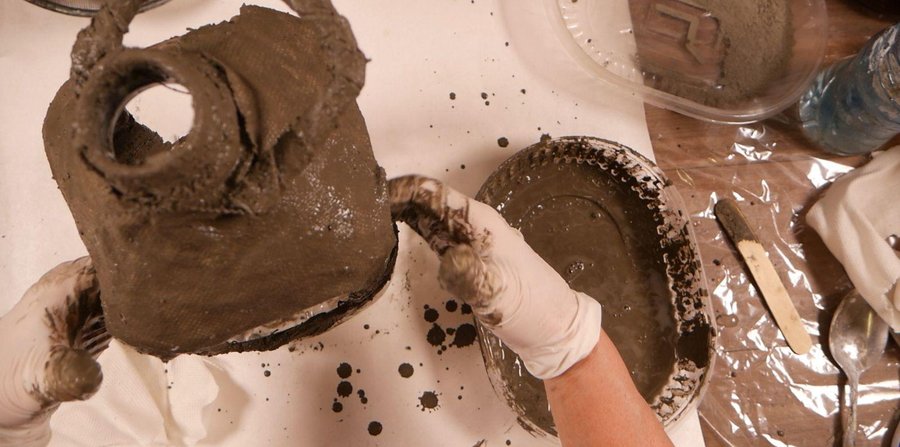 El trabajo consiste en cubrir todo el plástico del bidón con tela embebida en cemento.