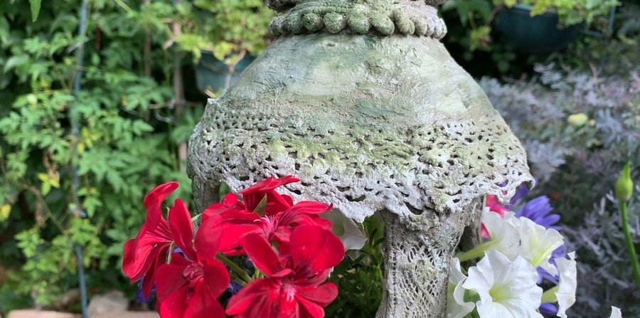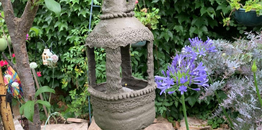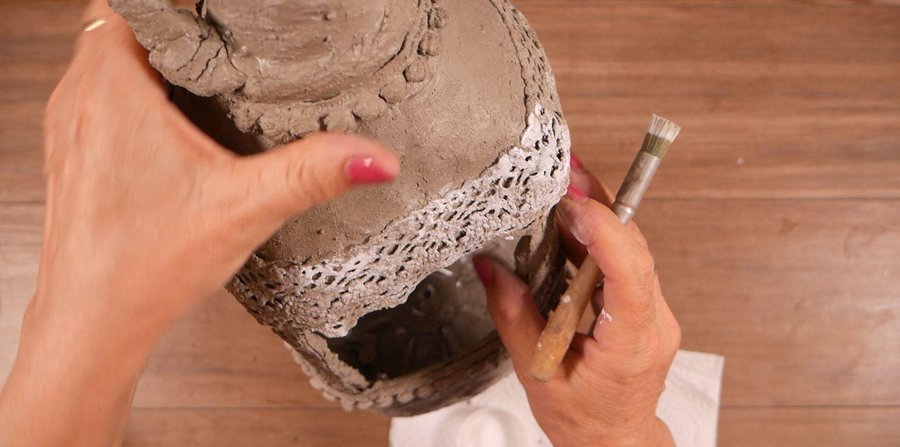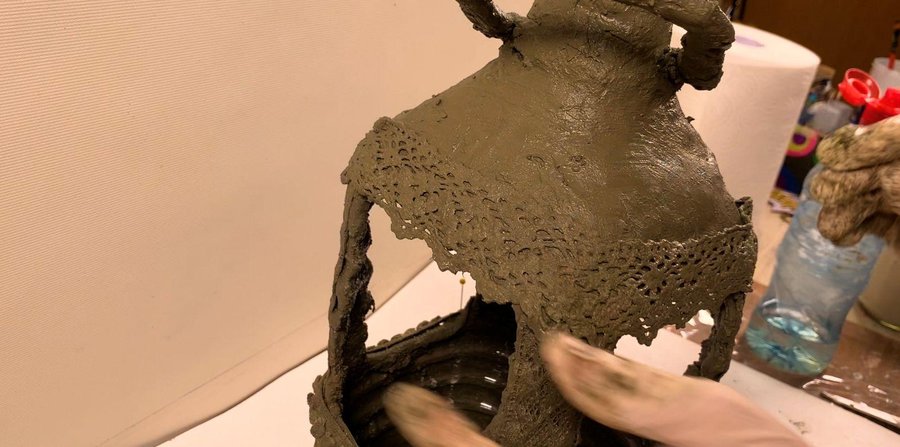 Cuando tengo oda la parte plástica ya cubierta con tela y cemento voy a agregarle los adornos.