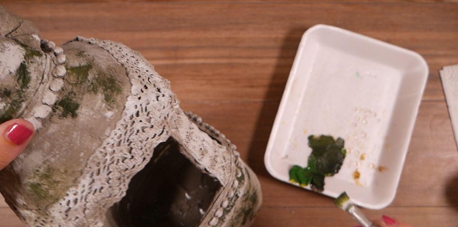 Aquí tengo pintura acrílica verde con un poco de negro para hacerle manchas tipo musgo o verdín, como algo viejo, que estuvo al intemperie.