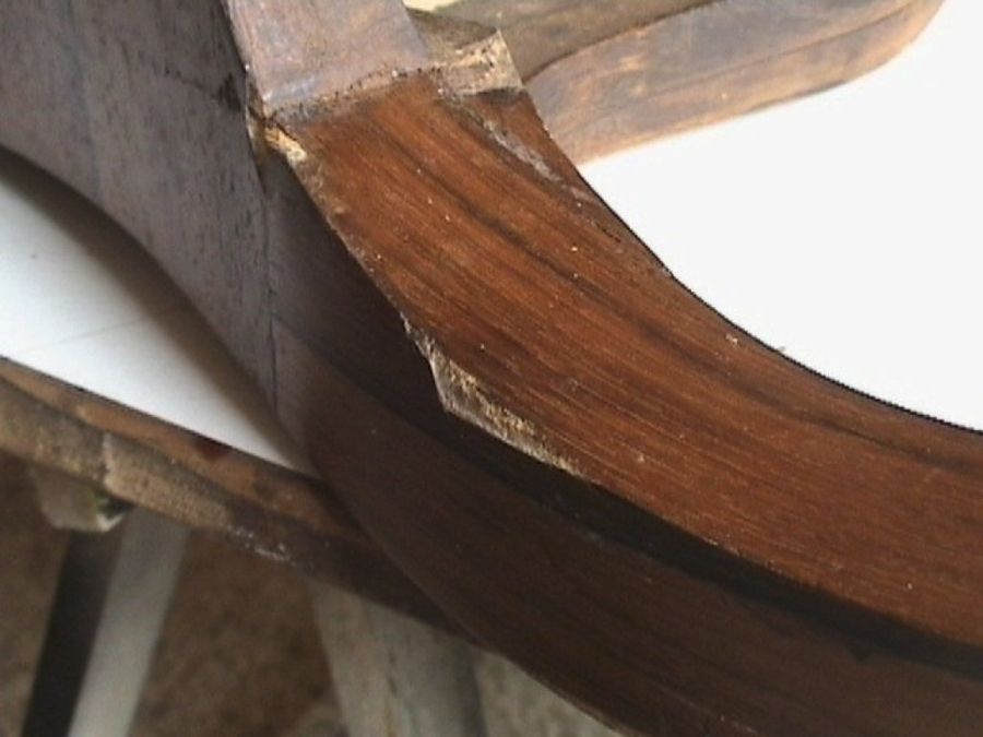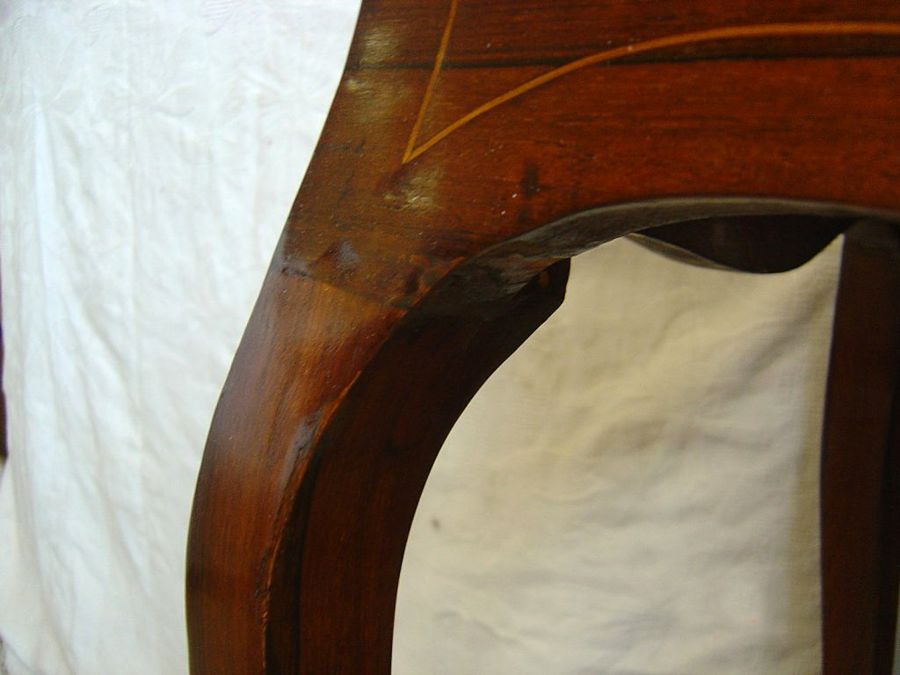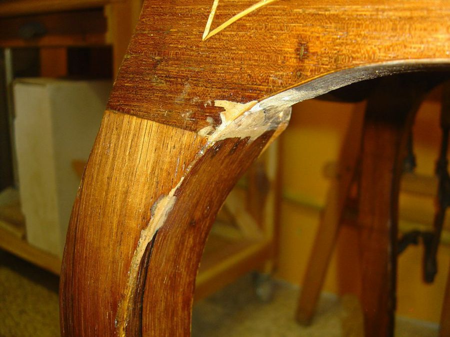 Para resanar con chapa nueva de caoba, debemos recortar y sacar plantillas de la nueva chapa, y pegar los trozos con cola de conejo haciendo coincidir la veta en lo posible. “En los cantos se deja sobrante para luego recortar, limar y lijar”, indica Yenai.