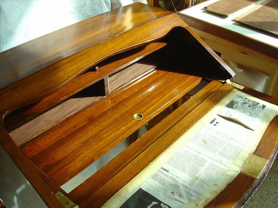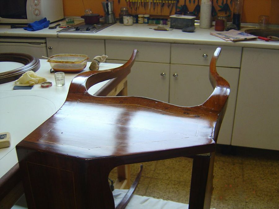 Según el profesor, un mueble de caoba y palo santo debe tener un acabado muy brillante. El gusto moderno es diferente y a Yenai no le convence demasiado el brillo, pero de todas formas respeta el consejo del profesional. Por ello, después de pintar aplica sucesivas manos de goma laca.
