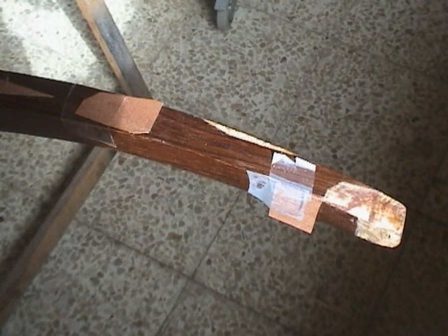 La superficie presentaba infinidad de muescas, así como algunas grietas. Tras consultar a su profesor de restauración, Yenai decidió taparlas con pasta de madera, barnizar, y finalmente completar el arreglo con lo que ella denomina ‘reintegración pictórica’: colorear con témperas imitando las vetas.