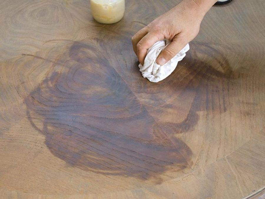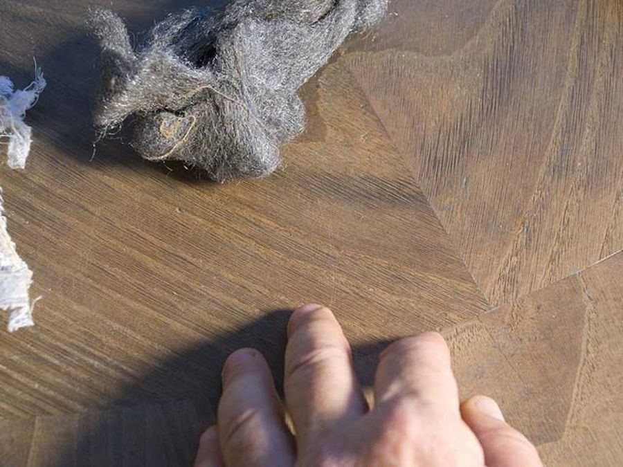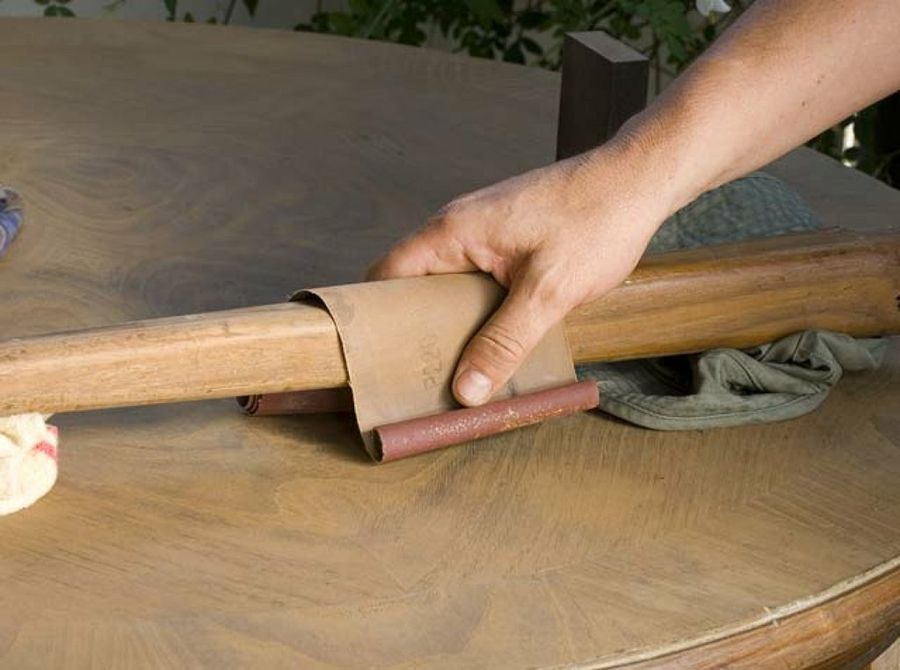 Un requisito importante es quitar el polvo con un paño limpio, al tiempo que lijamos. Tras finalizar la primera fase, limpiamos la mesa concienzudamente con un paño que no suelte pelusa, impregnado en esencia de trementina..