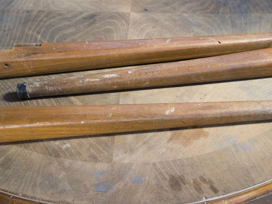 La mesa tiene cuatro patas, de las que hemos desarmado tres, dejando una sin desmontar. El motivo es que el ensamble fue reforzado en algún momento con clavos, y quitarlos podría ocasionar una holgura de difícil solución