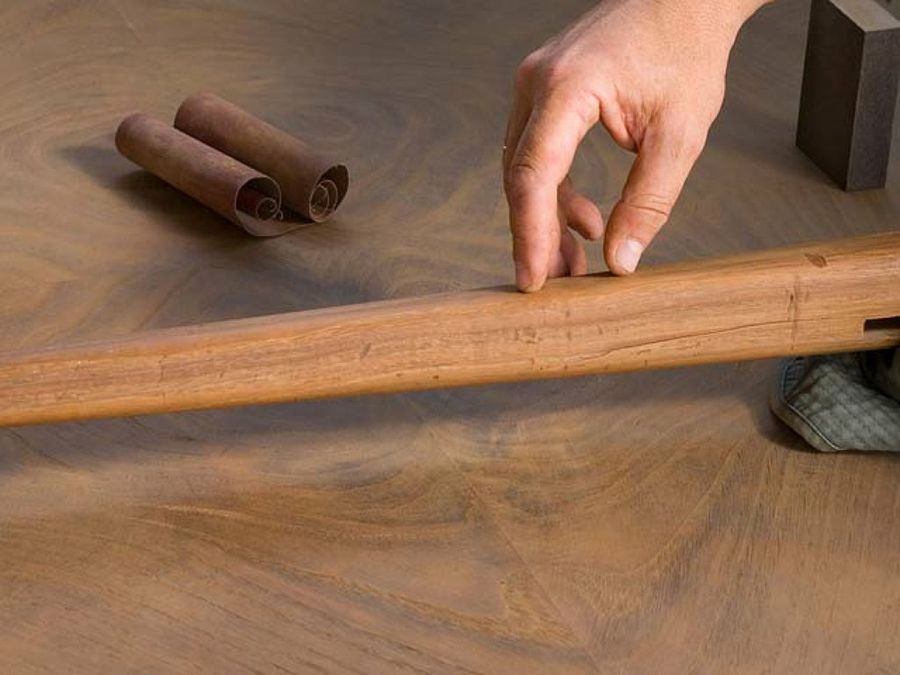Una vez seleccionados los utensilios idóneos, comenzamos la limpieza en toda la superficie. Lo hacemos primero a mano, con un papel del número 220, hasta verificar en todo el círculo de madera que el tratamiento es adecuado y no dañará la parte más visible del mueble.