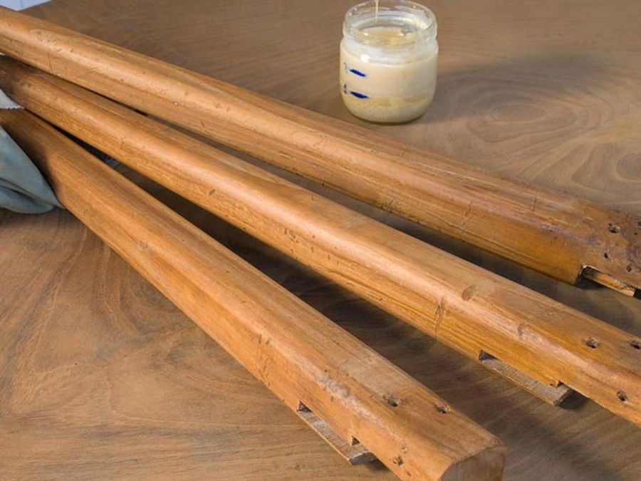 Hemos fundido al baño María cera de abeja, cera carnauba y parafina, para mezclarlas después con esencia de trementina al 80%. Así conseguimos un acabado artesanal llamado pátina de anticuario, muy beneficioso para la madera.
