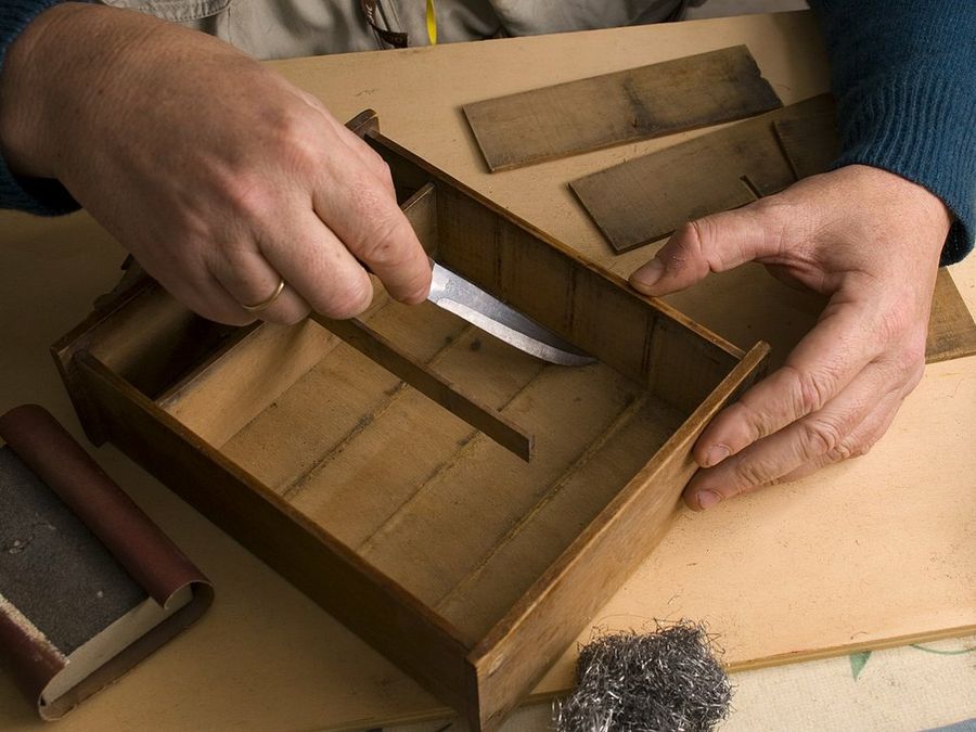 La caja del especiero no presenta ataques de xilófagos. Rascamos con un cuchillo las aristas interiores y lijamos bien por dentro.