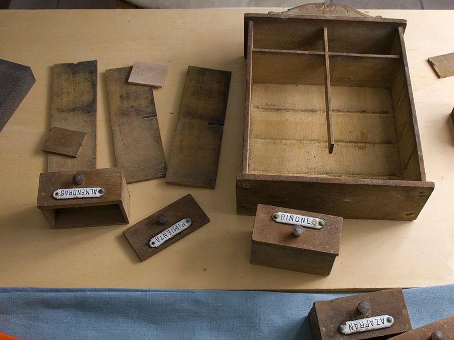 Rehacer un especiero antiguo es un momento muy bonito para crear. Este simpático armarito es un especiero que tiene casi un siglo, y sus rótulos evocan el aroma hogareño de una época sin las prisas de hoy en día. Después de 30 años arrumbado en un trastero, los estragos son patentes: hay indicios de carcoma, los apliques de esmalte tienen corrosión, la madera se ha resentido por la falta de nutrientes, y uno de los cajoncillos viene desarmado.