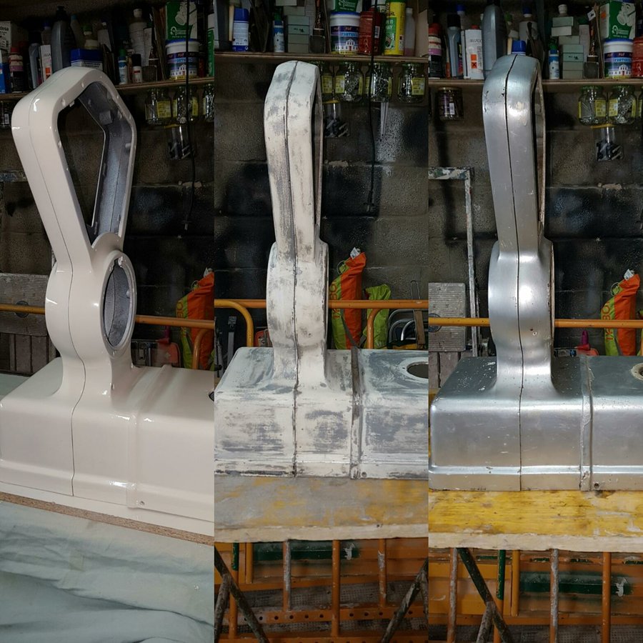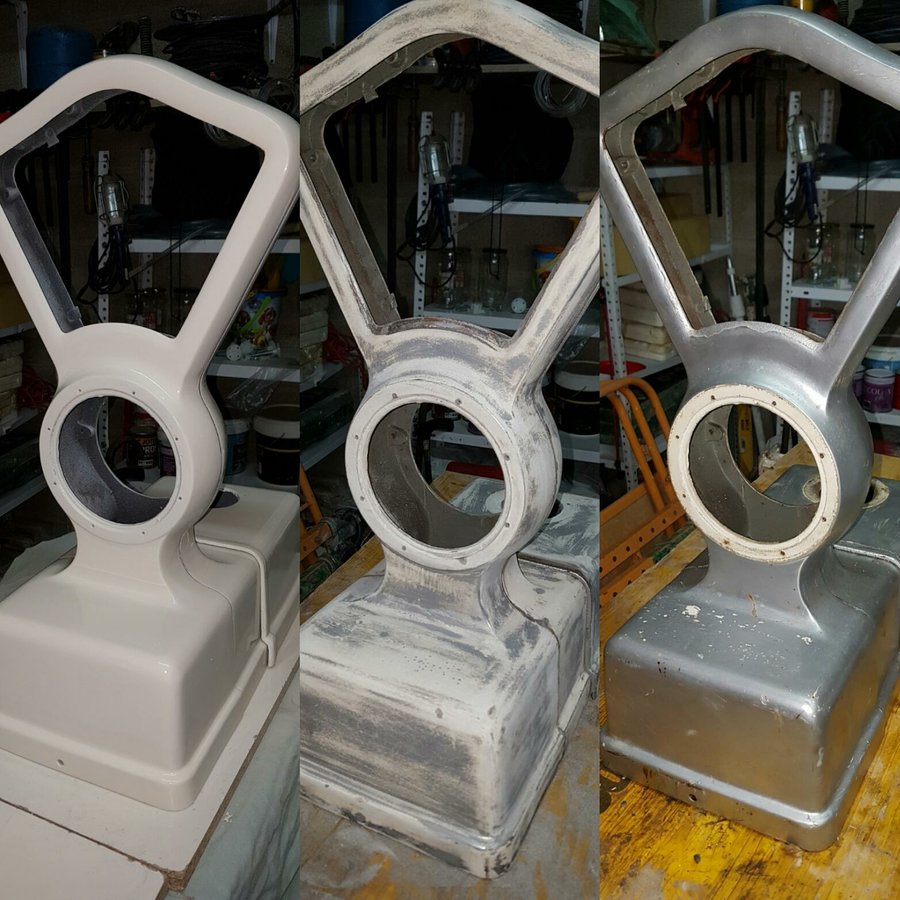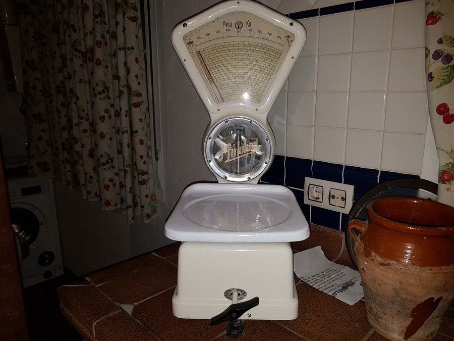 Aqui se aprecia el paso a paso de la parte exterior de la bascula, Despues de haberla desmontado por completo, lijado, haber reparado algunos desperfectos del metal y haberle dado un par de manos de imprimacion gris, haberlas lijados con lija de grano muy fino ya por fin le di la primera capa de pintara de esmalte color blanco Beige, la lije con lija de grano 1500 y luego una segunda capa de pintura.