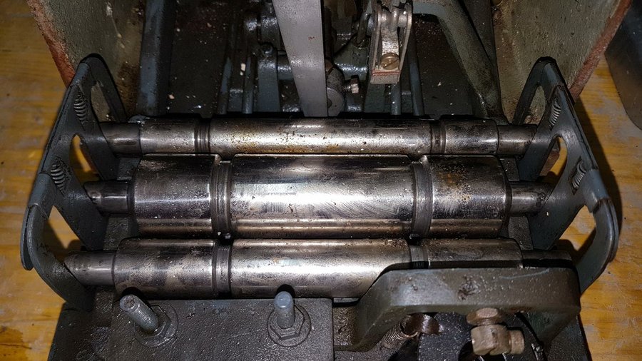 El antes y el despues de haberla desmontado, limpiado y pintado toda por dentro.Se puede ver el mecanismo que acciona todo el sistema de pesar y los pistones. Limpiado con disolvente, lijado y luego una imprimacion gris a todo.