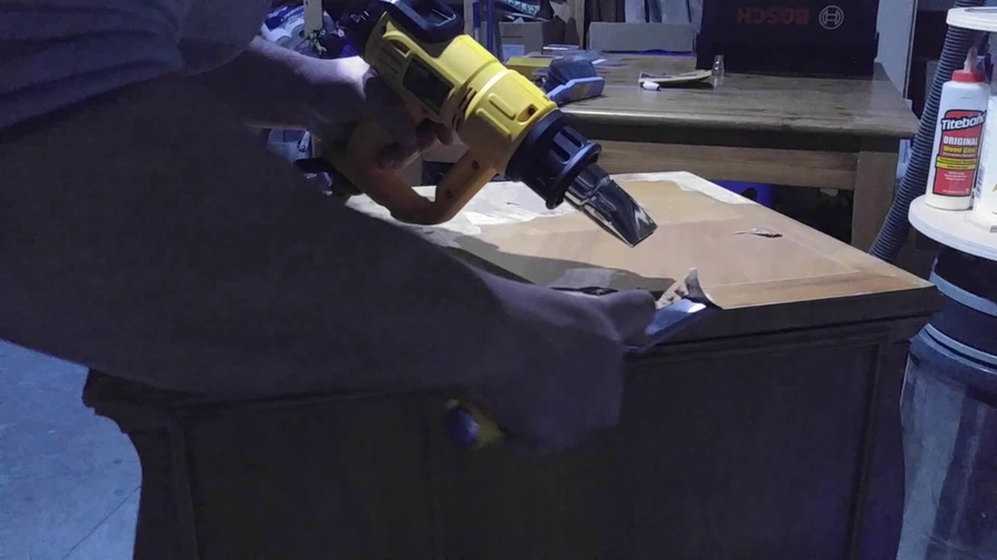 Lo primero que tenemos que hacer es retirar el chapado deteriorado. Con la pistola de calor vamos calentandolo para ablandar el adhesivo y poder retirarlo con la espátula y el formón (el mas ancho que tengáis) en las zonas que se resista...