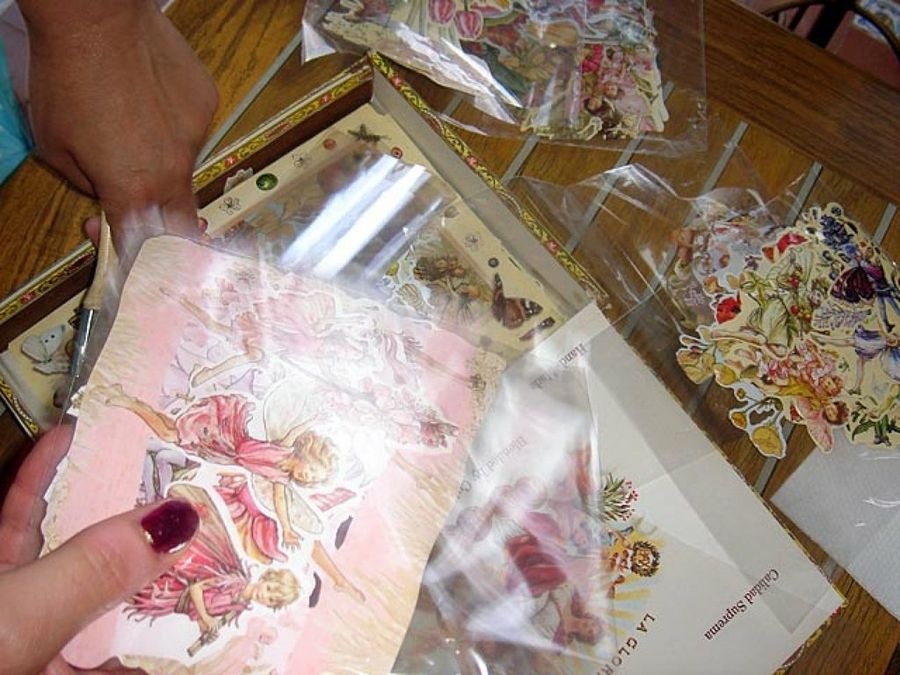 "Es como un jardín", dice María, "se empieza plantando las especies mayores, árboles y arbustos. Ponemos primero los cromos grandes, y los pequeños irán rellenando huecos. Hacerlo al revés da mal resultado". Una vez colocado en su sitio el cromo, hay que alisarlo con un paño para quitarle arrugas, pompas y cualquier anomalía: pronto se gastarían con el rozamiento dando lugar a roturas.
