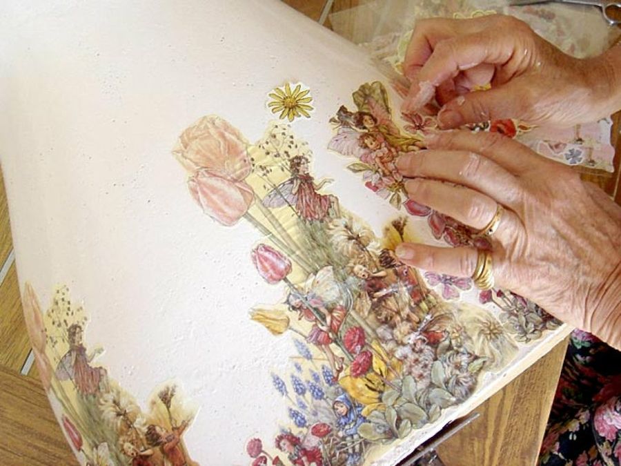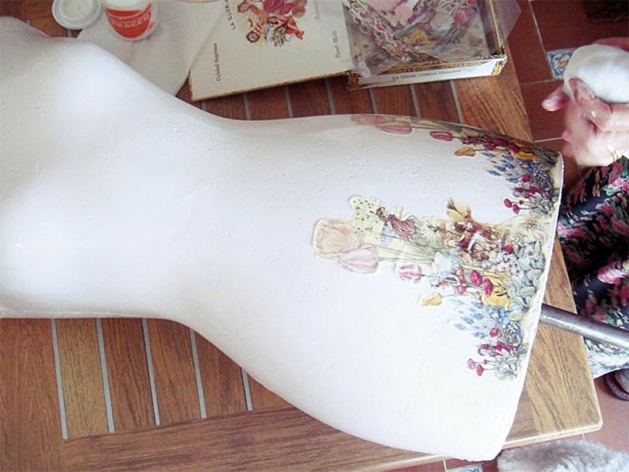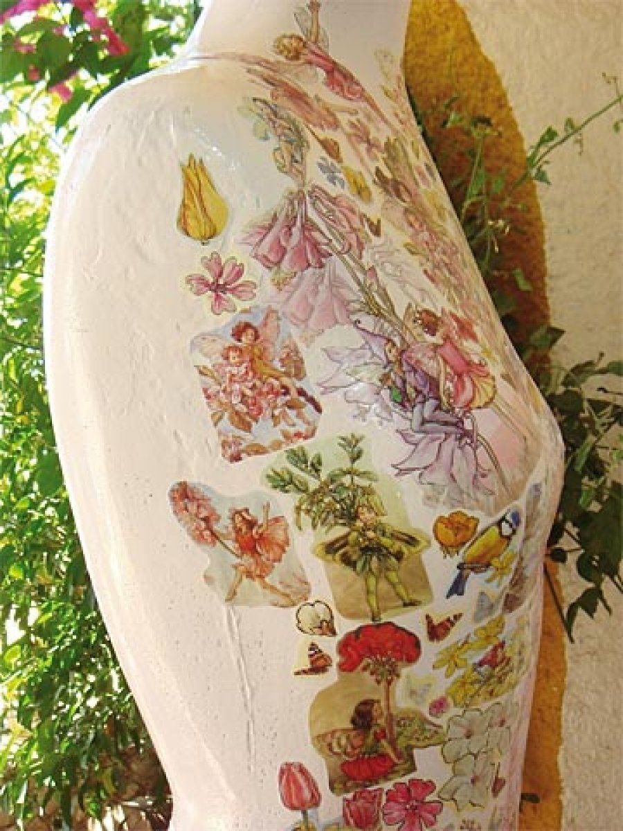 Es importante elegir una buena cola, y repasar cada dibujo con el trapo después de ponerlo. El secreto es conseguir un acabado perfectamente liso, de modo que los dibujos parezcan hechos sobre el mismo maniquí. Como vemos, los cromos grandes, medianos y pequeños se integran en un animado "paisaje", absolutamente único e irrepetible.