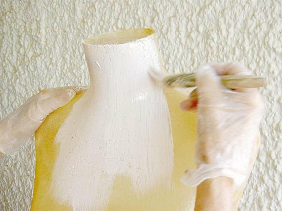 Con un paño de algodón nuestra amiga María quita los restos de adhesivo. Observaremos que se ha puesto un "mono de trabajo", y ha sacado el maniquí a la terraza, no porque vaya a utilizar productos tóxicos sino para ver el trabajo con luz natural. El primer paso del remozado es pintar el maniquí. María ha escogido un esmalte acrílico de color rosa suave, que usará sin rebajar. Antes lo mezcla a conciencia con un palito.