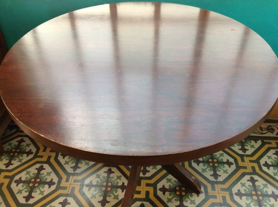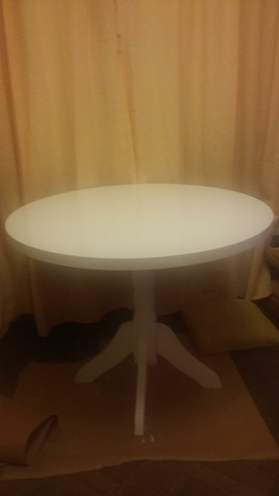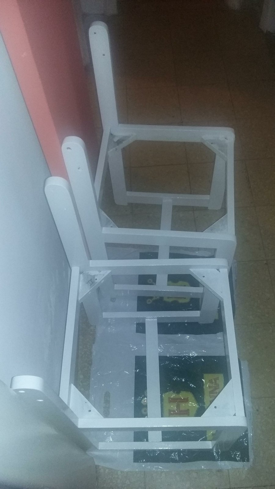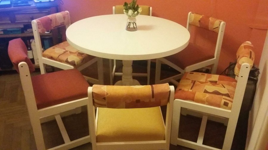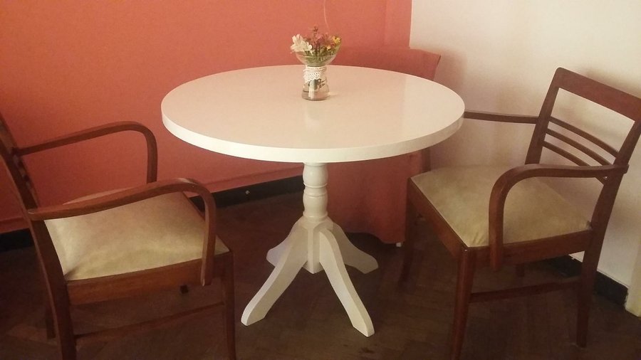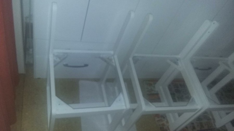 Esmalte blanco despues de lijar y ya en la primera mano se ve el cambio... Las sillas ya estaban blancas pero para unificar el color también las pintamos