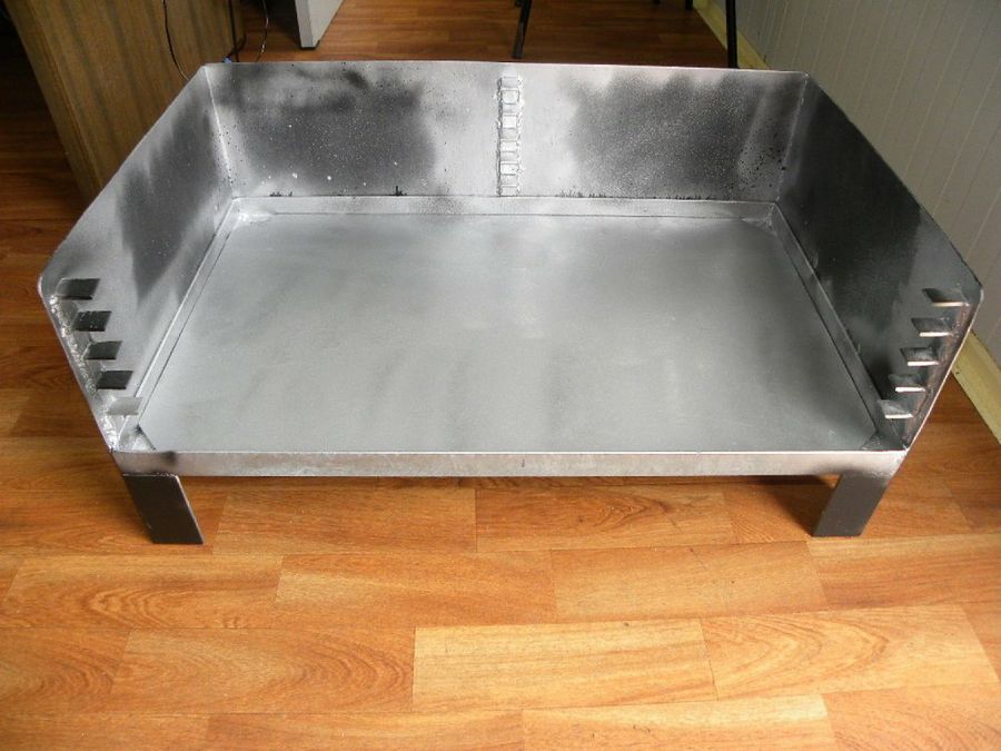 El material empleado es chapa de 3 mm, de la que se han cortado las piezas necesarias para montar las tres paredes, y ángulos de dos tamaños, para realizar las patas y el soporte perimetral de la bandeja. La soldadura ha sido el mecanismo empleado para unir cada pieza de la barbacoa.
