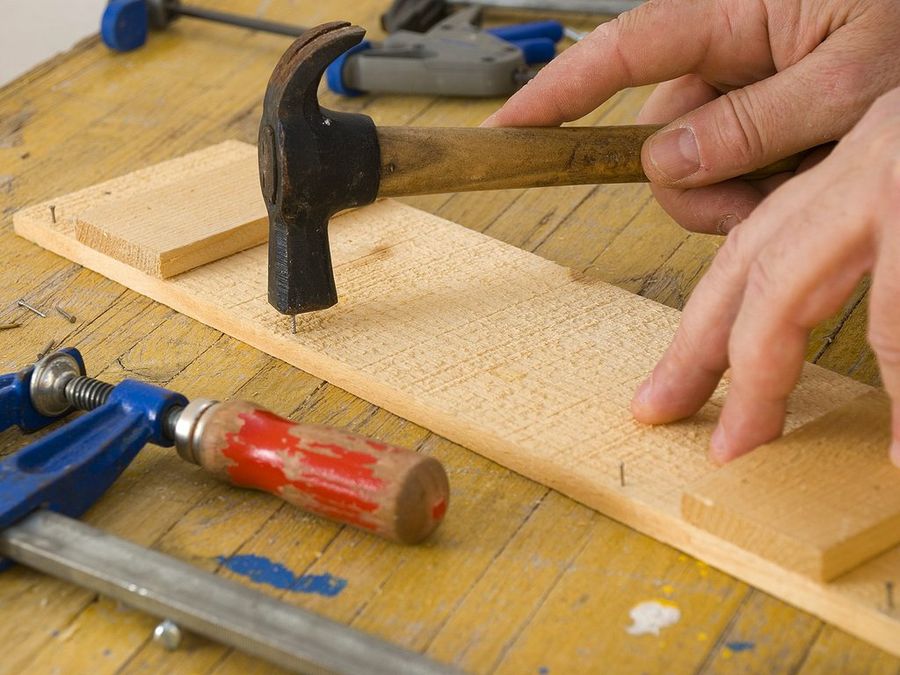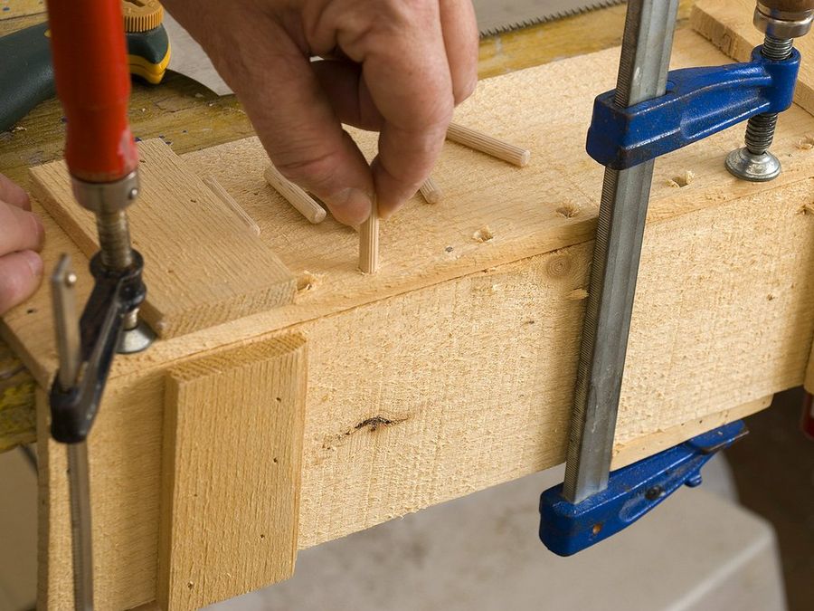 Encolaremos las dos tablas mediante espigas o tubillones. Antes ponemos unas puntillas que hacen más cómoda la tarea.