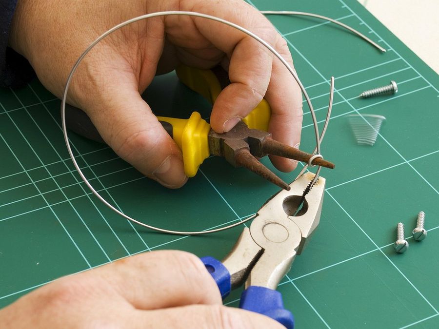 Domesticado ya el alambre, escogemos los tramos más limpiamente curvos y cortamos con el alicate normal la medida apropiada. Seguidamente haremos un bucle para los tornillos en cada extremo, con el alicate de bisutería. En esta fase lo más importante es no torcer la circunferencia, que será la parte vista del alambre.