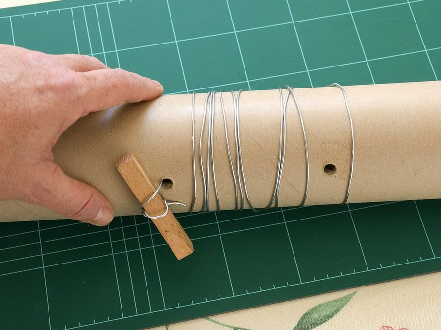 Mientras dejamos secar la cola, preparamos el rollo de alambre. Un tubo recio, del grosor de los frascos a almacenar, nos servirá para dar el diámetro adecuado a los aros. El alambre galvanizado de cierto grosor tiene una tenaz propensión a conservar su forma inicial, de modo que convendrá hacer agujeros en el tubo a fin de asegurar los extremos. En caso contrario, las vueltas serán tan inmanejables como un muelle.