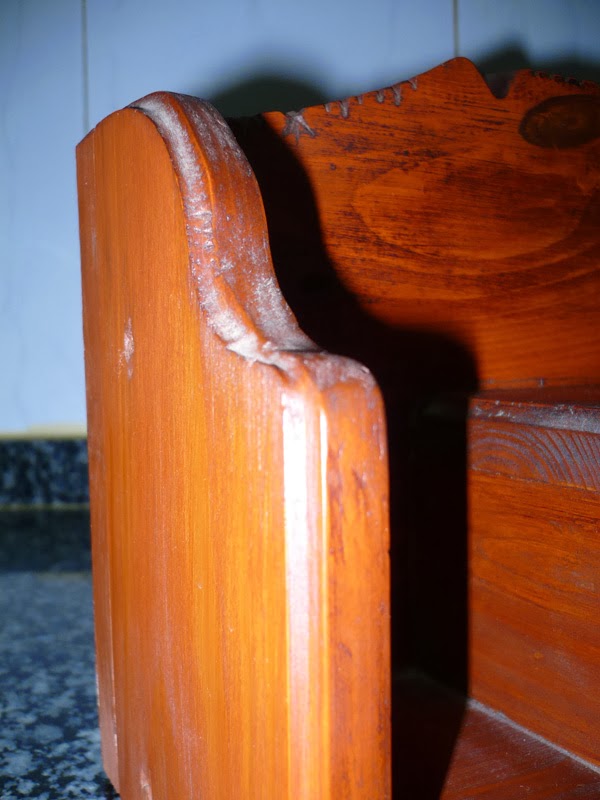 Aquí se aprecia que esto no esta echo ayer. Uno de los problemas de un acabado "rustico" es que es un imán del polvo, que se incrusta en todos los recovecos de la madera y no sale ni a tiros. Si a eso se une que,cuando lo hice estaba soltero, y no le daba la importancia que se merece al asunto de la iniciativa domestica, se a creado una patina de antiguedad fina. Y luego, que a mi esposa no le gusta tanto como a mi, tampoco le ha favorecido.