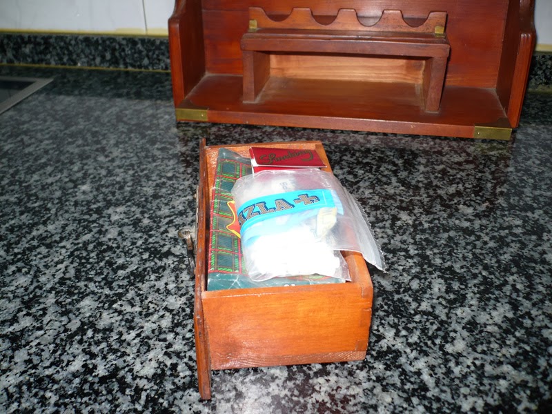Y llegamos al cajón. Aquí están los otros materiales a estudiar en su día. La tablilla del cajón, lógicamente, no es de palet. Son de sapelli, restos de unos marcos de puertas que se pusieron en casa de mis padres hace años. Como dicen los cocineros de prestigio, aquí no se tira nada.