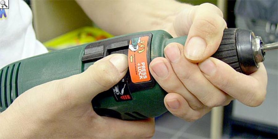 Para una sujeción firme, se aprieta el botón de la taladradora destinado a ello y se gira la parte en la que hemos insertado la broca.