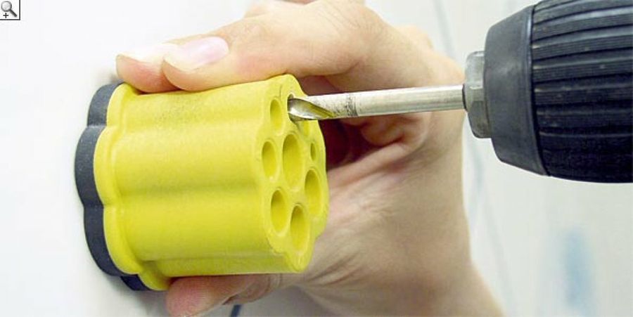 Situamos la broca en el punto señalado y hacemos presión en el fijador para que su goma haga ventosa con el azulejo y no se mueva.