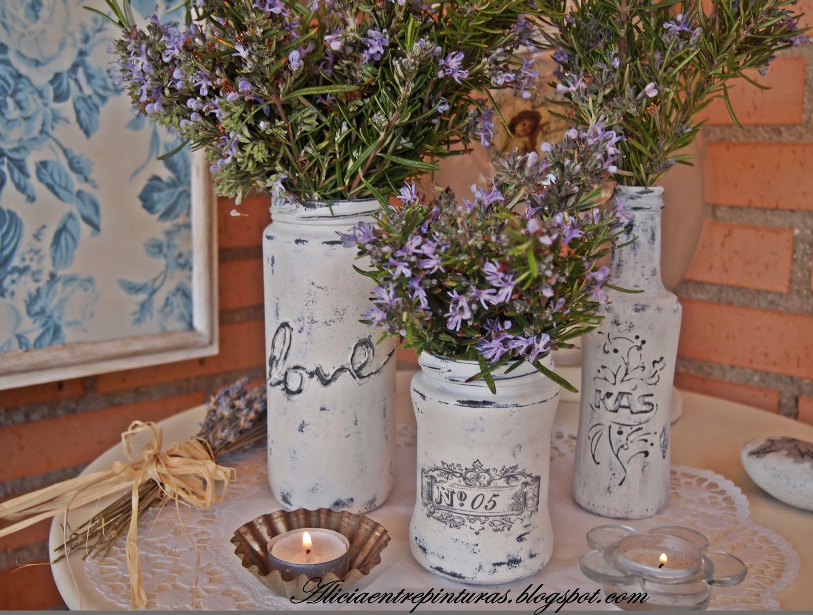 "Alicia en "Alicia entre pinturas" nos muestra cómo podemos transformar unos simples botes y botellas de cristal en unos jarrones tan delicados como estos