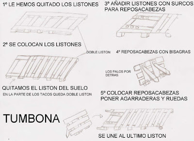 "Se a de buscar un palet de los que son estrechos y alargados, (normales tambien sirven) y otro normal que los listones sean de la misma medida. Los listones de arriba van en vertical y se han de quitar, todos menos los dos de los extremos y cortar para ponerlos en horizontal sobre los dos que quedaron, dejando un espacio entre ellos de unos 5 cm. mas o menos y dejando un espacio libre en la parte de arriba que se destinara para el reposacabezas, contando que este será de unos 3 listones.