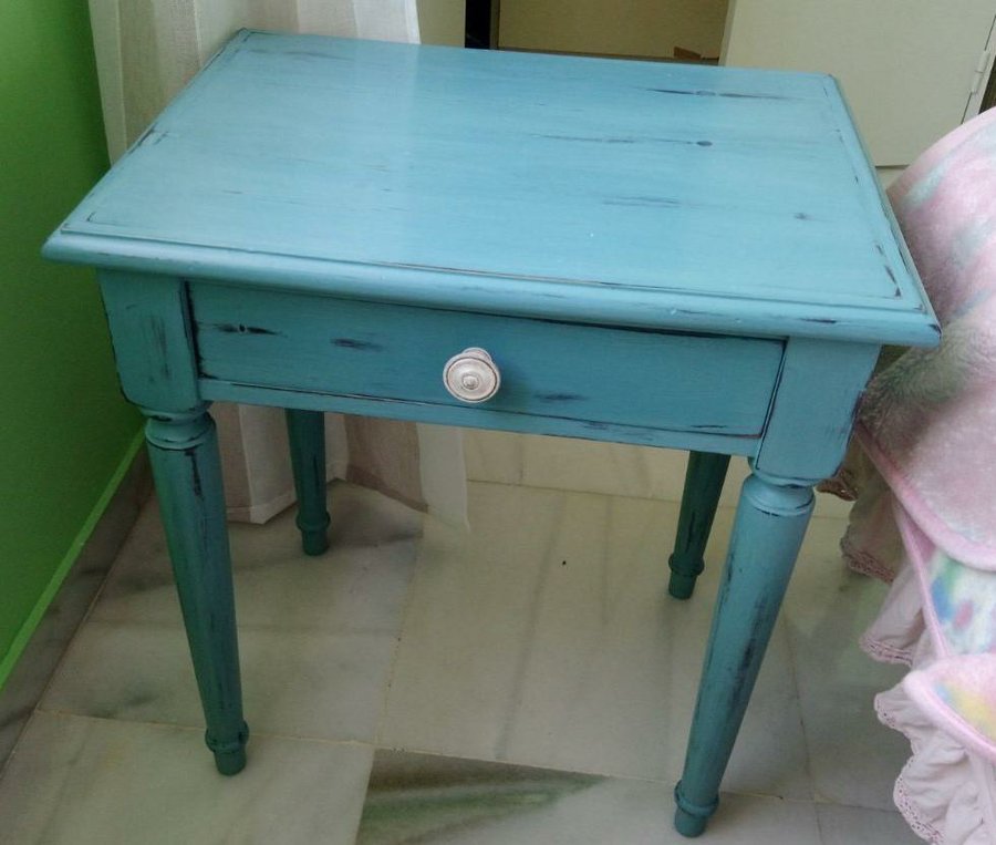 Mi idea era pintarla de un turquesa y darle un aspecto desgastado. Así que empecé con un lijado y seguidamente me puse manos a la obra con la pintura. Elegí una Chalk Paint de Titan en color turquesa que es muy fácil de aplicar, es un poco espesa pero si se rebaja con un poco de agua le puedes dar la consistencia que más te convenza. Yo la compré en Bricodepot y compré también una cera incolora para madera para darle el acabado final.