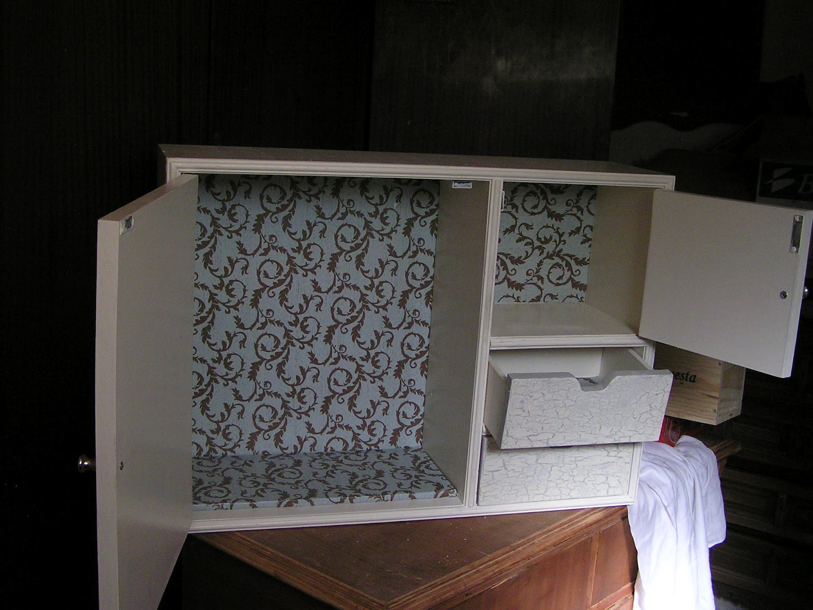 Empapelé el mueble con un papel adhesivo en tonos marrones y grises que le iba muy bien, cambié los tiradores y dentro le puse una pequeña balda para poder colocar más cosas