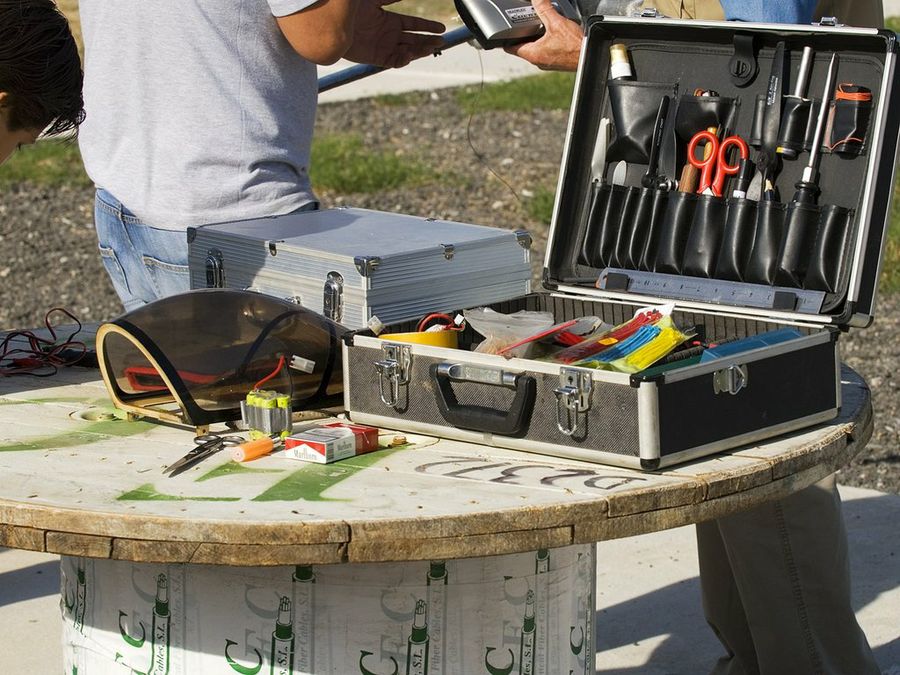 Una vez en el campo, los aeromodelistas despliegan su habilidad de bricolegas en una serie de accesorios que facilitan los preparativos del vuelo, y también las eventuales reparaciones. Desde las cajas de vuelo a la propia pista de aterrizaje, numerosos elementos de fabricación personal allanan el camino a la gran fiesta de los aviones.