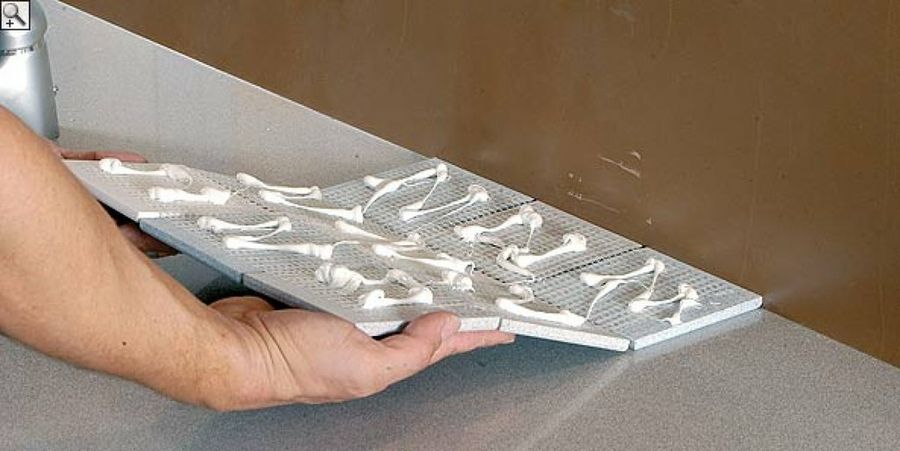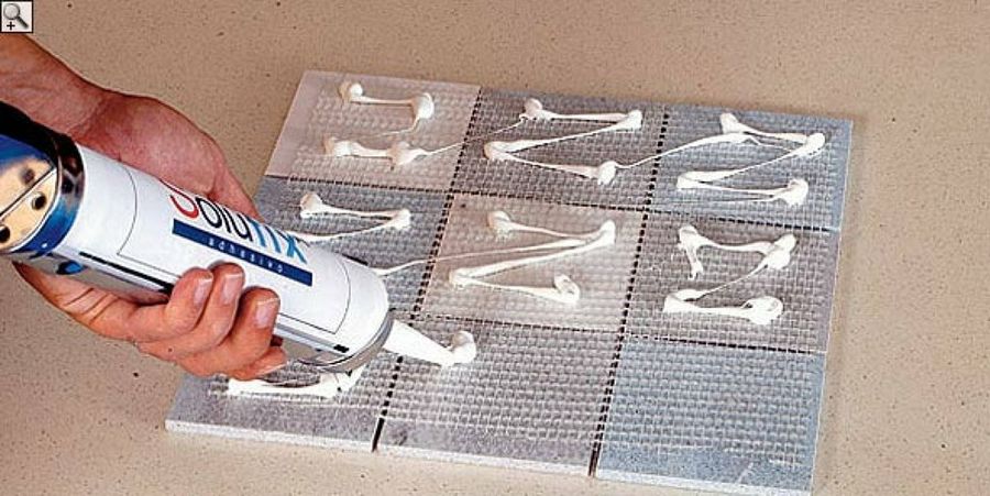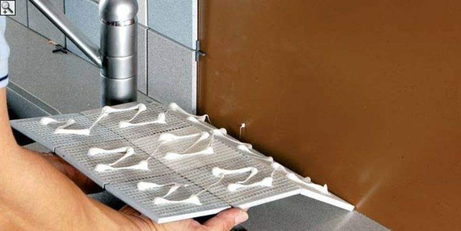 Pon el adhesivo detrás de cada pieza de la malla y plantéala sobre la pared a revestir, apoyándola sobre la base (se recomienda empezar por un lateral).