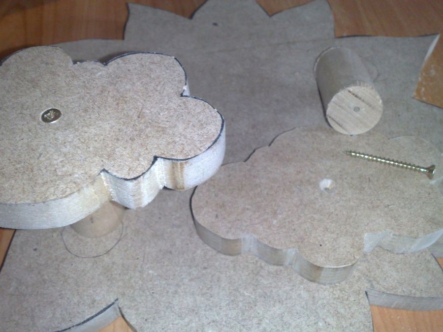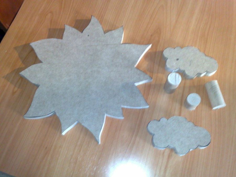 Seguidamente recortó las figuras con la sierra caladora, acoplando una hoja estrecha apta para trazos curvos. Aquí vemos las piezas, dos nubes y un sol, y también unos vástagos de madera, de unos 60 mm de largo y 25 mm de grosor.