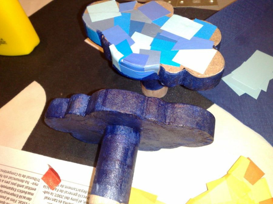 Nuestro amigo encontró cierta dificultad al manejar ese tipo de papel, y aconseja las servilletas, que se amoldan con facilidad a los ángulos. Loxly las utilizó para dar a las nubes la primera capa de color, de esa manera no hizo falta plegar los rebeldes papelillos azules para cubrir los laterales.