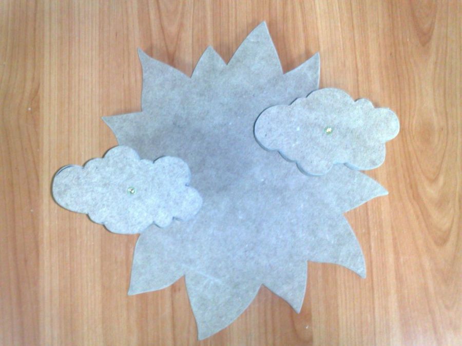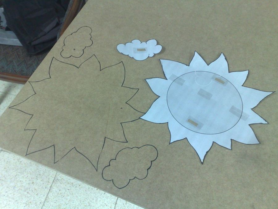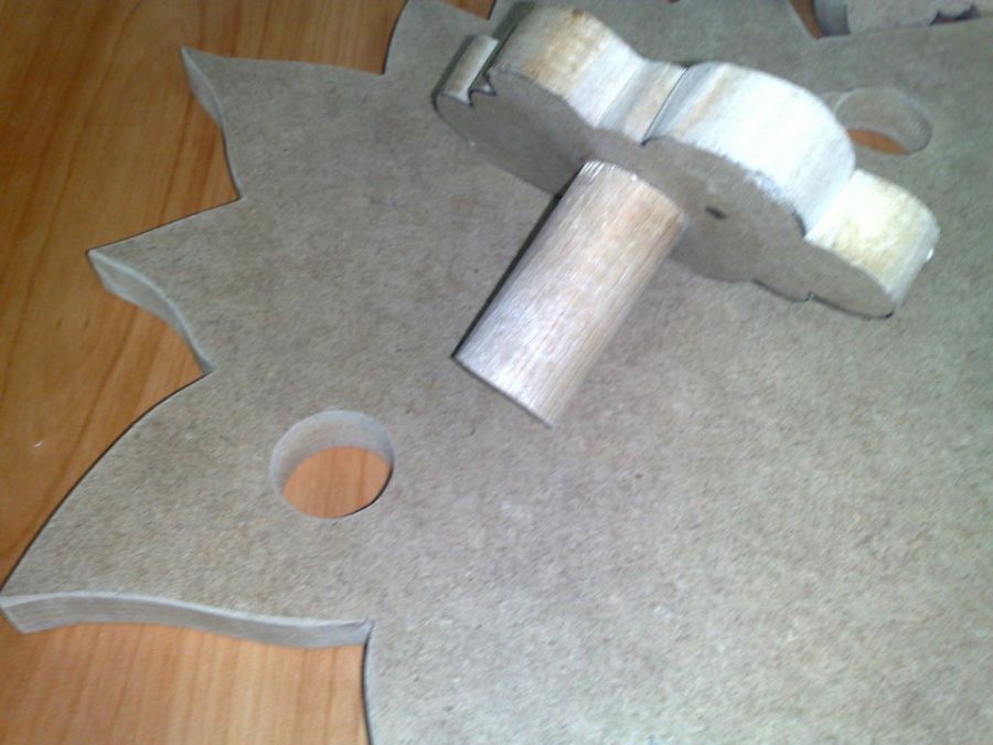 Los vástagos de las nubes van insertados en el sol mediante taladros pasantes, hechos con la broca de corona. Todos los cantos de las tres figuras fueron suavizados con una lijadora del tipo mouse.