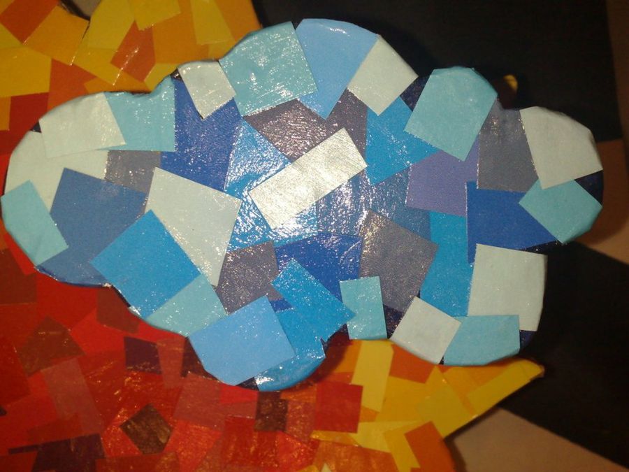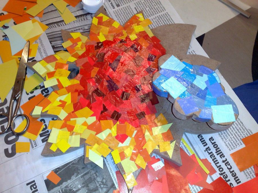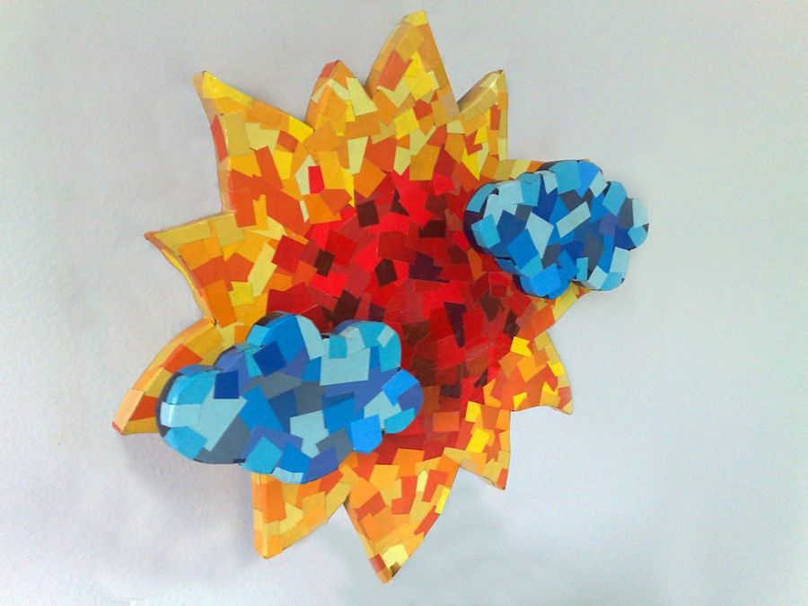 Loxly da comienzo al original mosaico, que ha obtenido recortando páginas coloreadas de algunas revistas. Los papelillos van adheridos con barniz cola, dejando los rojos en el centro y los amarillos y naranjas en el exterior. Las nubes se visten de color azul.