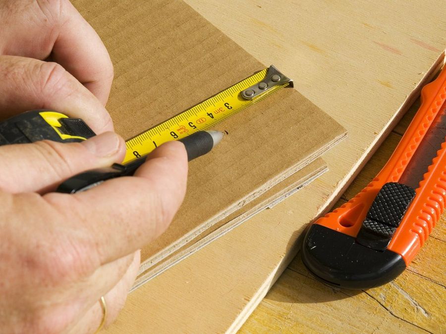 La materia prima que usaremos es el cartón. Una vez medida la ventana, buscamos un embalaje de tamaño adecuado y lo desguazamos con el cúter.Después de recortar a ojo los dos laterales, utilizamos un tablero, que habremos verificado con la escuadra, para hacer los cortes definitivos.