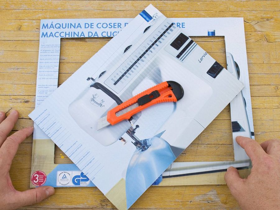 El cartón se trabaja fácilmente con ese utensilio, y en un minuto realizamos los dos marcos que formarán el “sandwich” para la tela mosquitera.