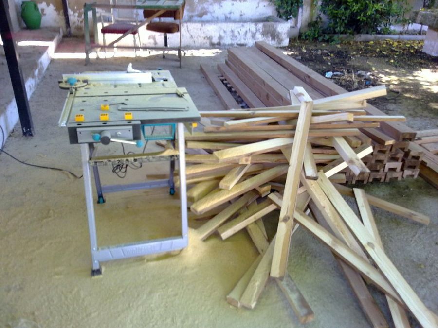 " Pero el resto había que cortarlas al hilo de la madera, a lo largo para sacar lamas y travesaños, en este caso tuve que echar mano de la verdadera master. No es muy robusta esa mesa, pero sí muy eficaz. Jamás pensé que desarrollaría tanto trabajo en un día".