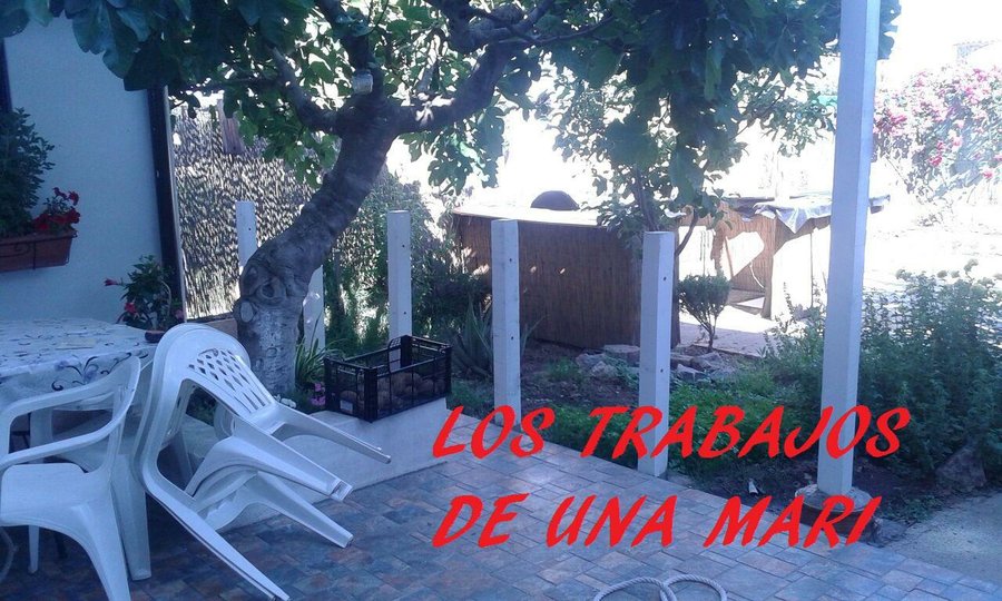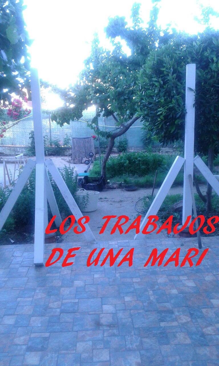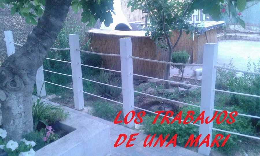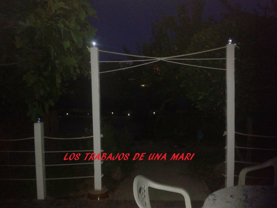 Para ello hemos contado con 5 postes de madera cuadrados de 2,5 metros de alto y 9 cm de ancho, soga y cuerda, imprimación, pintura blanca, 8 lámparas solares, 6 bases cuadradas de acero galvanizado, dos olletas de barro y hormigón.
