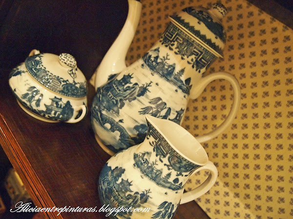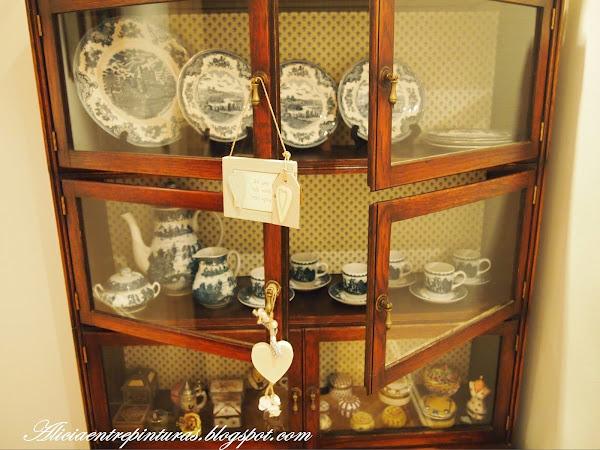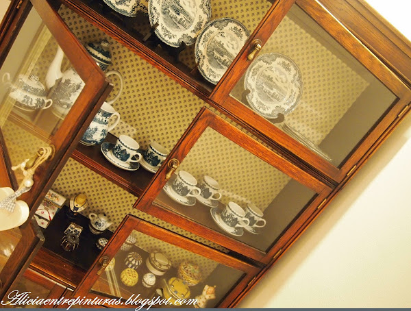 En esta vitrina guardo recuerdos de viajes, algunas piezas de calidad como mi porcelana inglesa azul y "chuminadas" varias que una no sabe donde guardar.