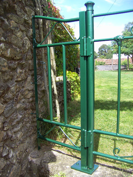 Para cerrare la puerta simplemente hice un agujero con un taladro en la pared de la misma medida que el pestillo y, para que la puerta no se dañase al abrirla chocando con el muro, le atornillé a este un tope de los que se usan para las puertas de casa. Al estar cubierto de goma resistirá perfectamente- Puse uno en el muro y otro en la pared de la casa.