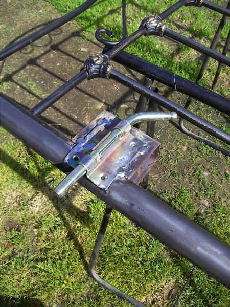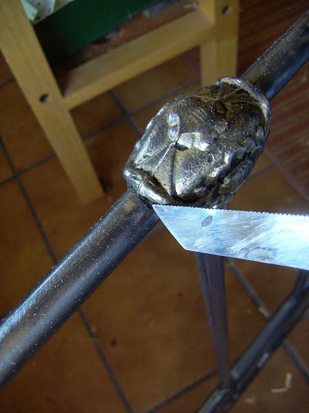 Para hacer el cerrojo , soldamos al cabecero una pieza y, a ésta un pestillo. Este es más bien de los que van al suelo pero a mi me gustó para ponerlo ahí.