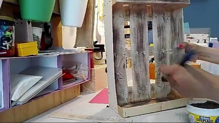 Lo primero que haremos es pegar con cola blanca las 4 columnas de la caja de fresa grande a la parte superior de nuestro cajón.Con el producto que tengas para oscurecer la madera pintamos toda la caja y los listones de madera que tenemos reservados de las otras ✌️ cajas.